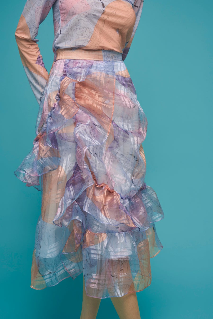 程よいハリと光沢があるオーガンジー素材に、オリジナルプリントを施した華やかなラッフルスカート。