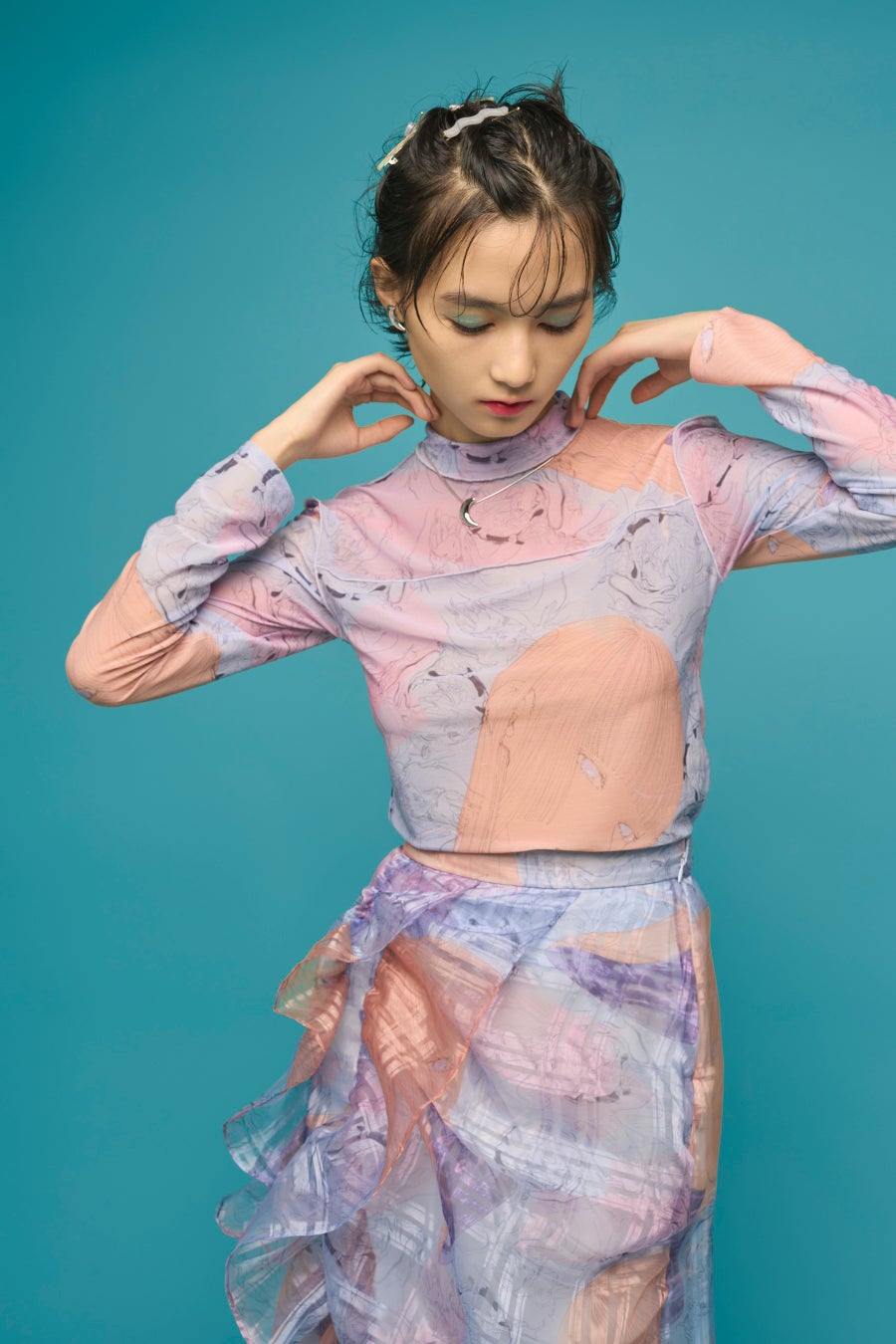 薄手でやや透け感のあるカットソー生地に、大胆にオリジナルプリントを施したシアートップス。