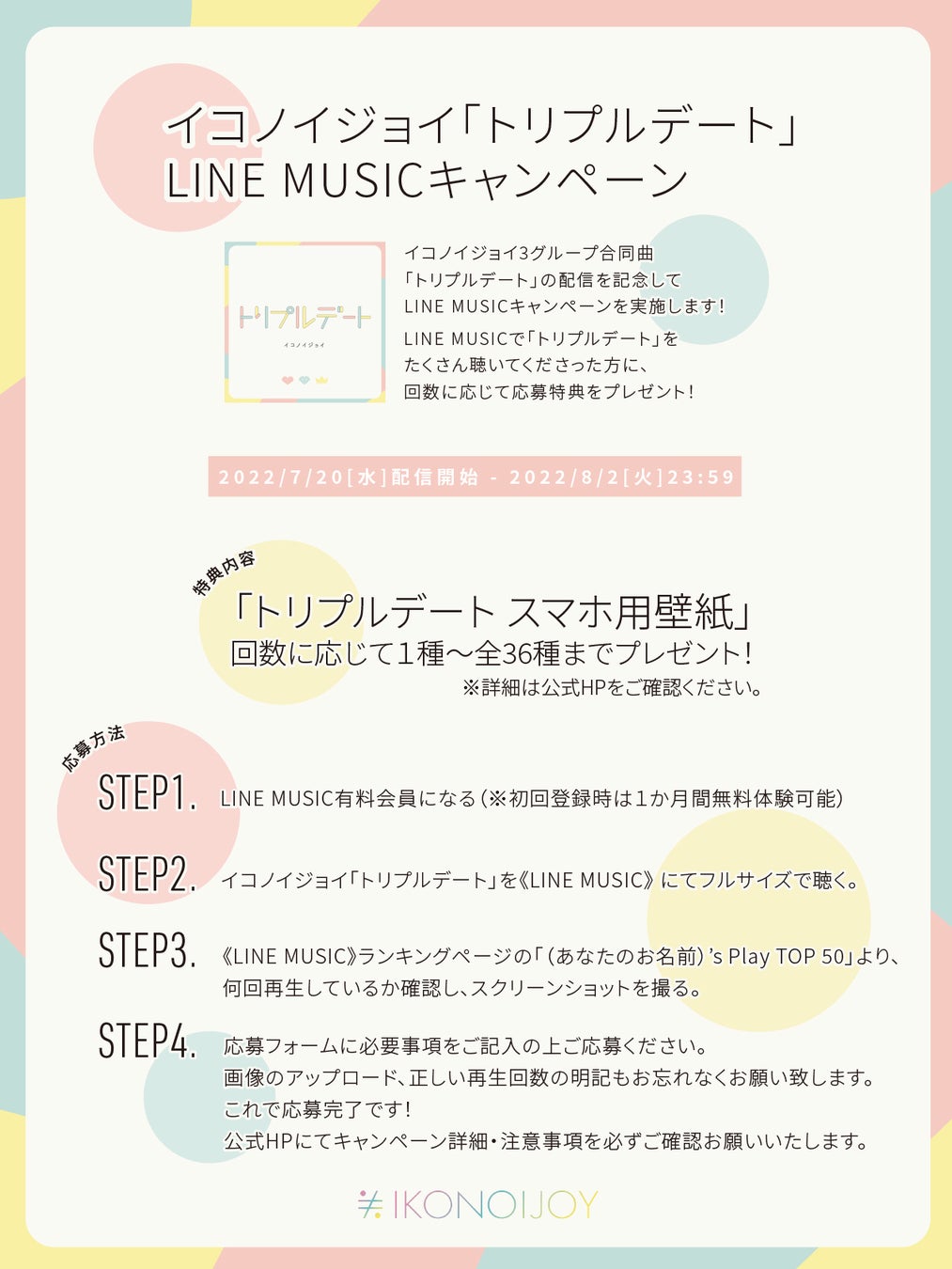 イコノイジョイ3グループ合同楽曲「トリプルデート」の配信を記念してLINE MUSICキャンペーンを実施致します!LINE MUSICで「トリプルデート」をたくさん聴いてくださった方に、回数に応じて応募特典をプレゼント!