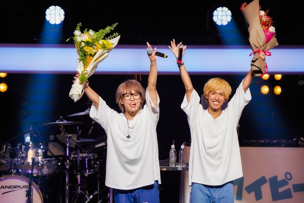そのあとはもう、自由時間。MCでどんなことを話すか毎回決めていないというふたりは、とりあえずツアーの振り返りトークを始める。しかし、☆イニ☆が「(このツアーは)柏から始まって……」と本ツアーで訪れてすらいない街の名前を挙げてしまい、テオから「柏じゃなーい!」とツッコまれる始末。