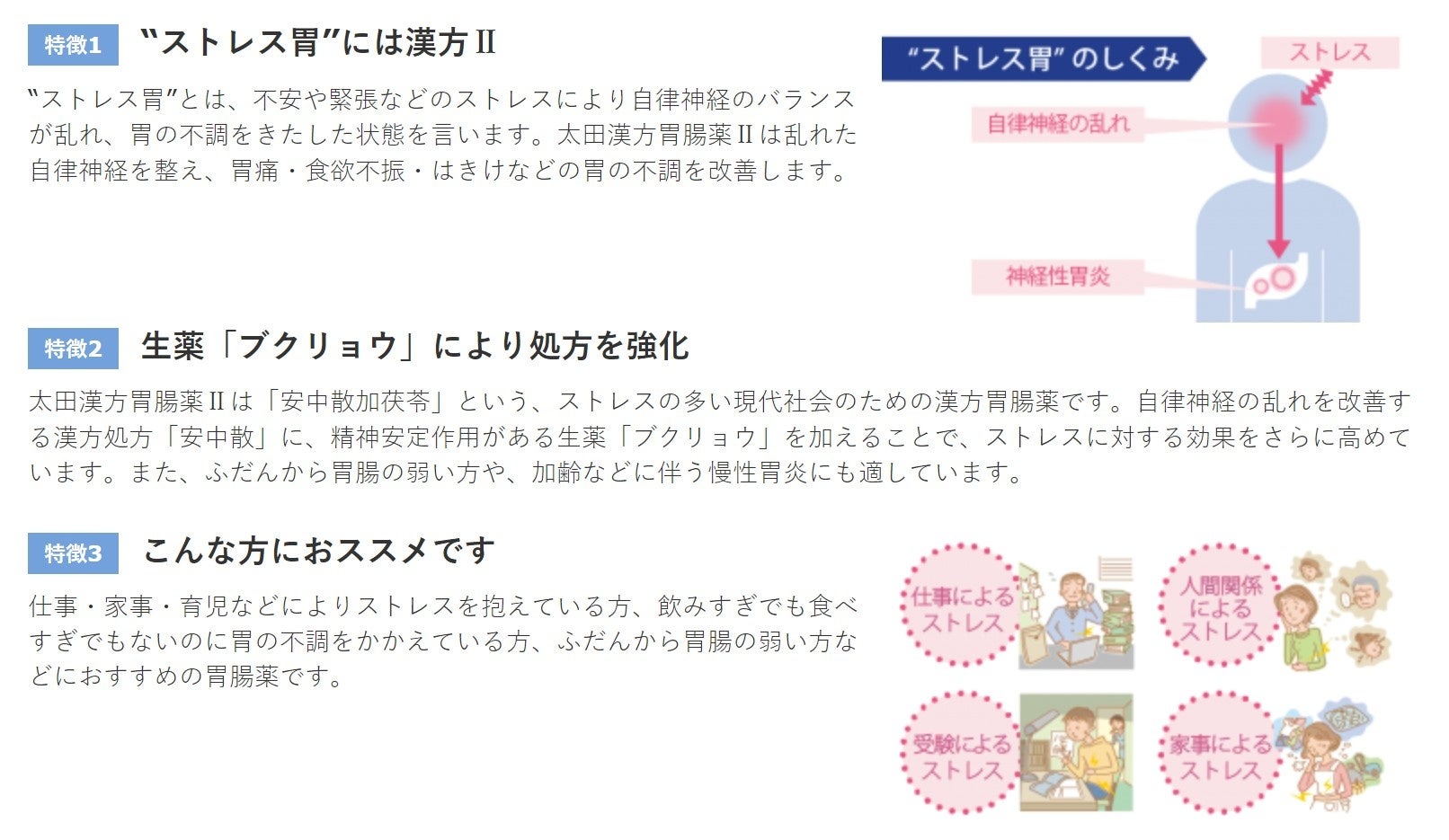 ストレスが原因の胃の不調=ストレス胃には、「太田漢方胃腸薬Ⅱ」がおすすめです。ストレス胃をガマンせず、「ももイロのパッケージ」を目印に、お近くの薬局・ドラッグストアにてお買い求めください。