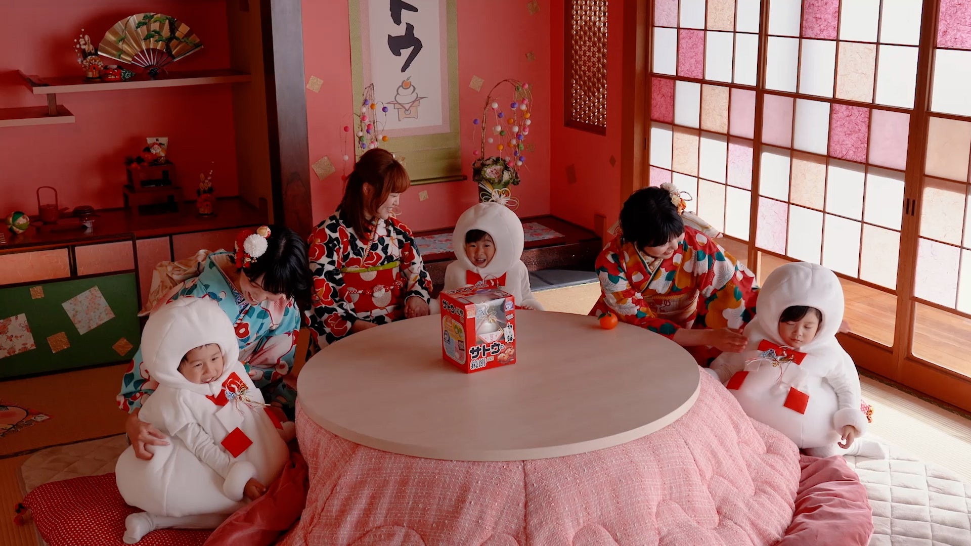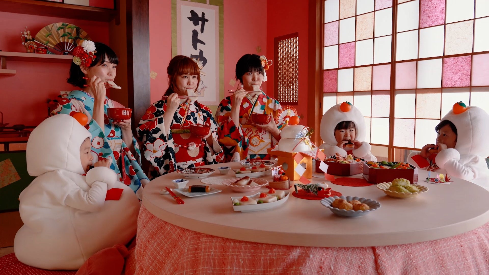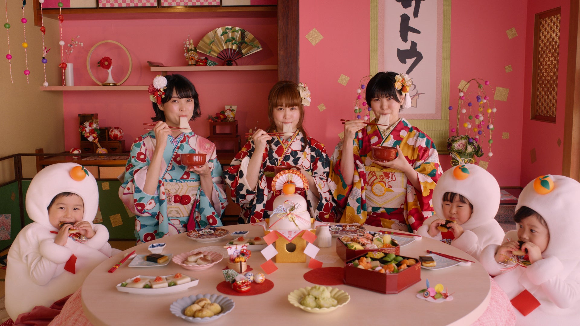 新CMではかわいく飾られた和室を舞台に、晴れ着姿のNegiccoと、子どもたちが扮する鏡餅の妖精が共演。こたつを囲みながらみんなで鏡餅を飾ったり、中に入っているお餅をお雑煮などにしておいしく食べたりと、鏡餅を飾る楽しさや食べるおいしさを表現している。