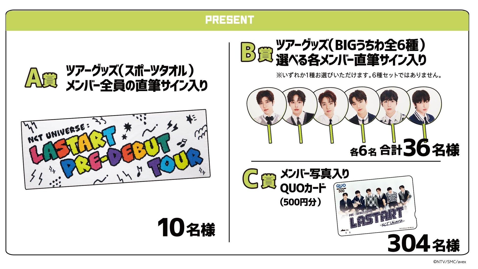レシートを撮影してWEBサイトから応募すると、抽選で合計350名様にNCT NEW TEAM(仮)ツアーグッズ他プレゼントが当たります。