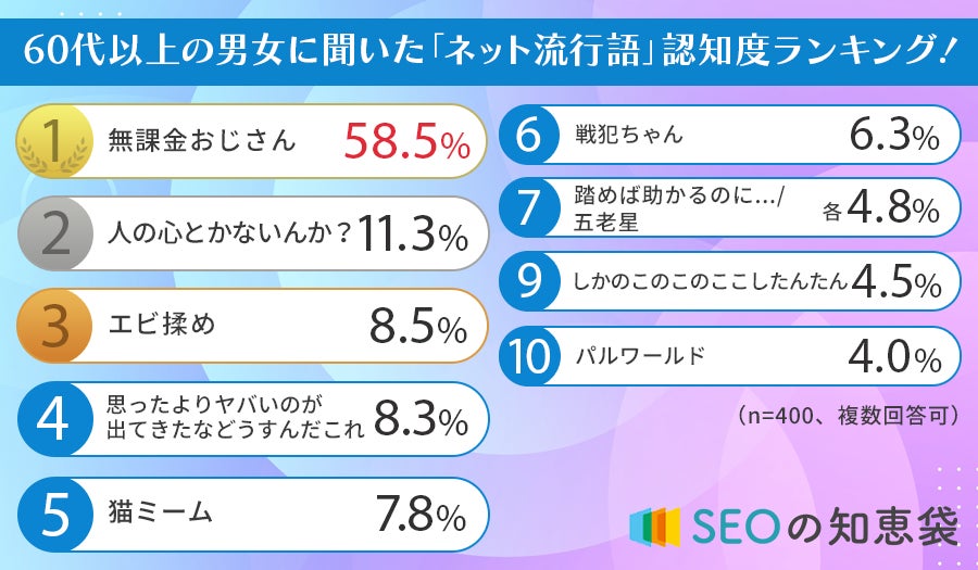 続いて、60代以上の男女に聞いた「ネット流行語」認知度ランキングを紹介します。