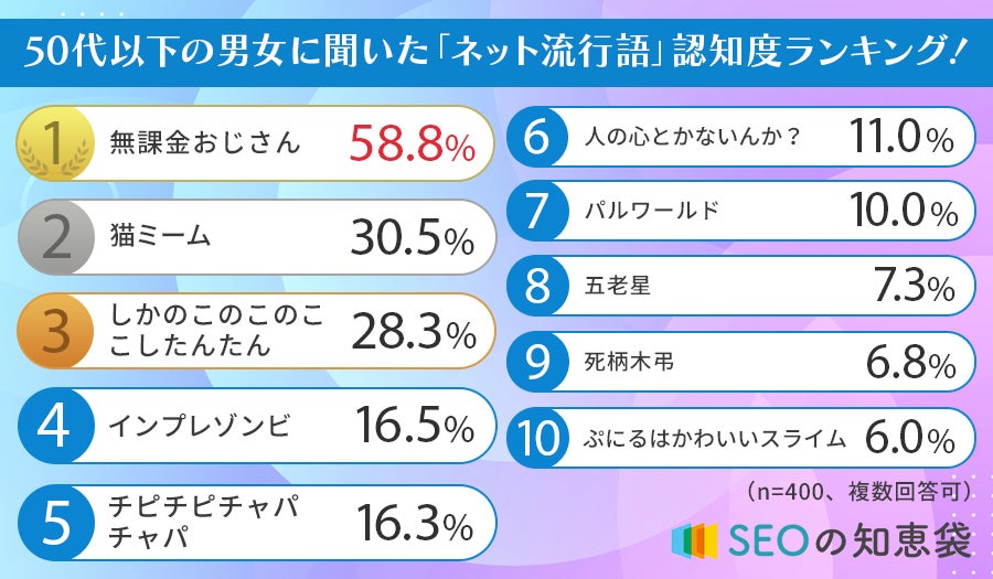まずは、50代以下の男女に聞いた「ネット流行語」認知度ランキングを紹介します。