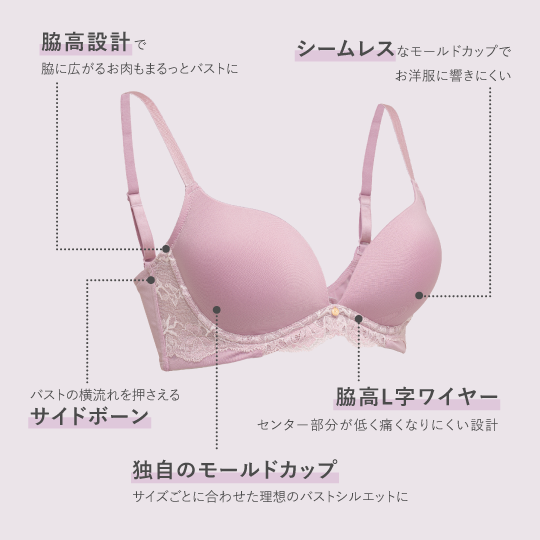 気になる脇肉をバストへと導き、横流れを防いで、すっきりとしたボディシルエットと高さのある美しいバストをメイク。さらに、サイズごとに厚みを変えた独自のモールドカップが、バストに合わせた理想の”まる胸”を実現します。