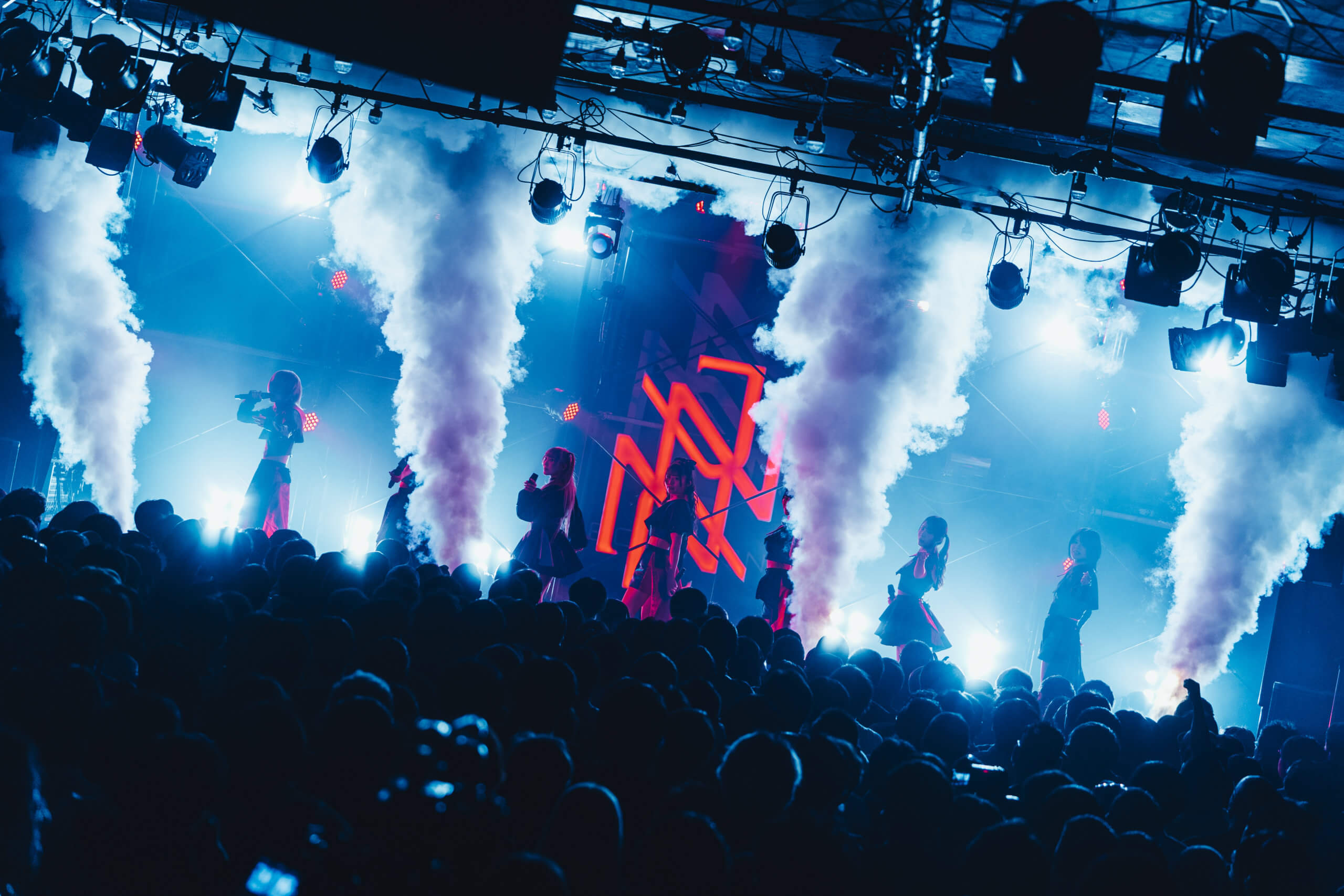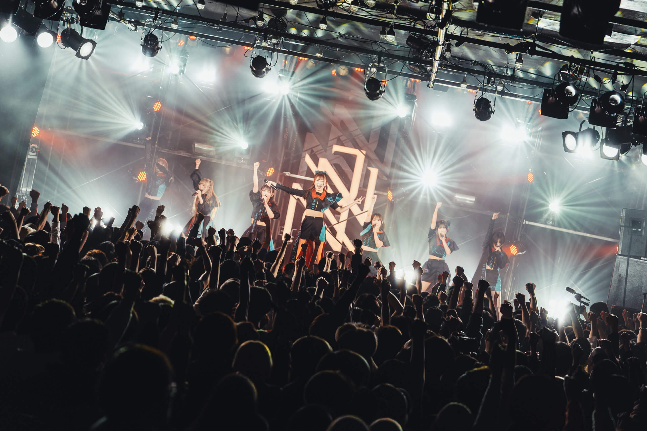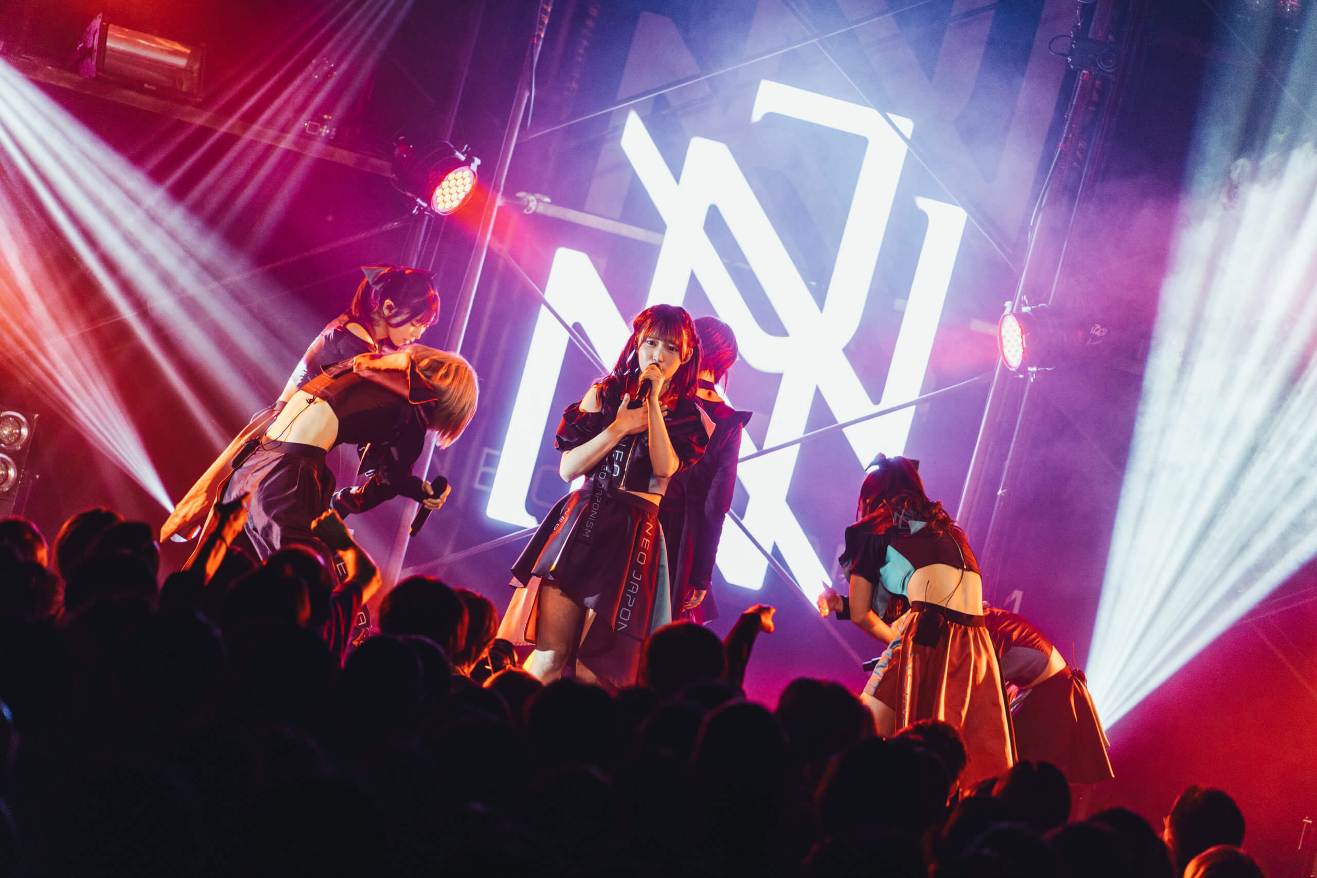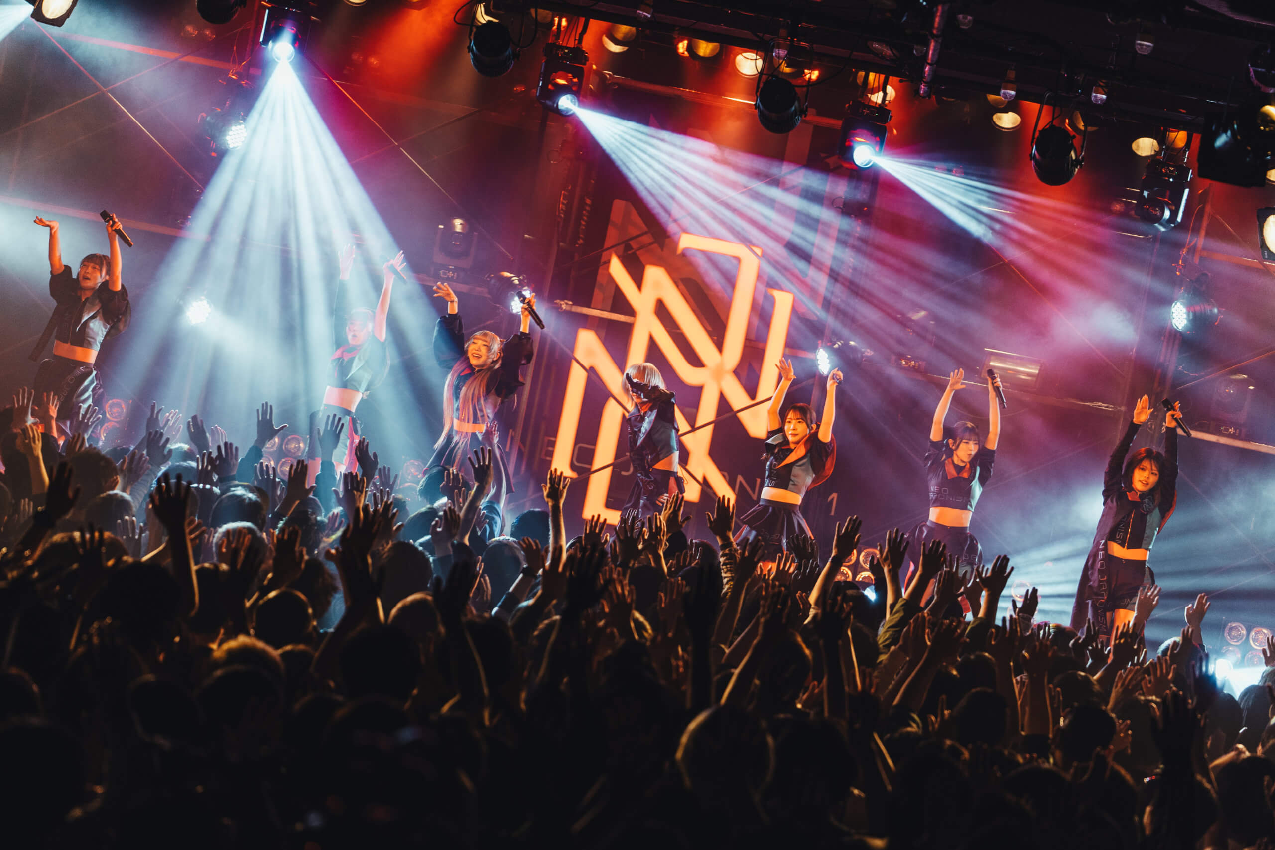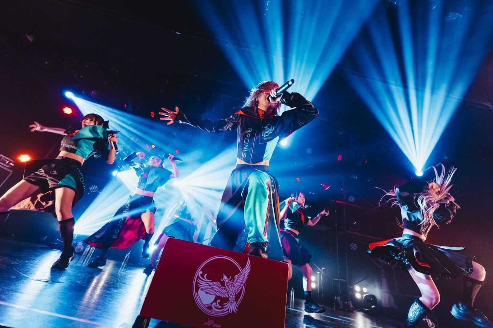 照明が落ち、開演を知らせるSEが響くと、稲妻のような激しいライトが炸裂。新メンバー本多 ともはが加わった新たなNEO JAPONISMが登場する。